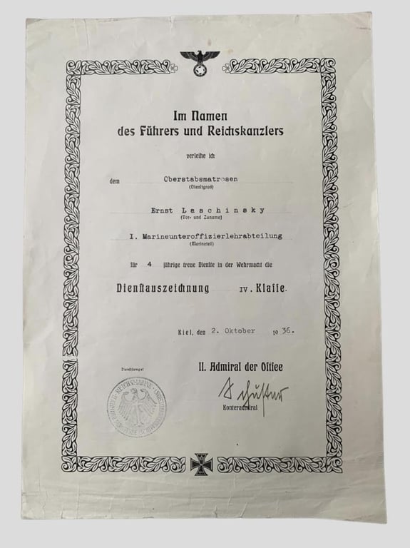 In good condition a German WWII Award/Document of 4 year of faithful service in the Wehrmacht.